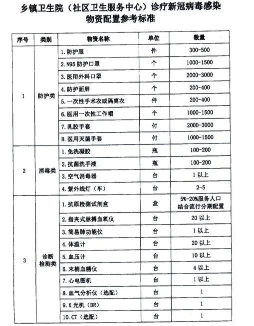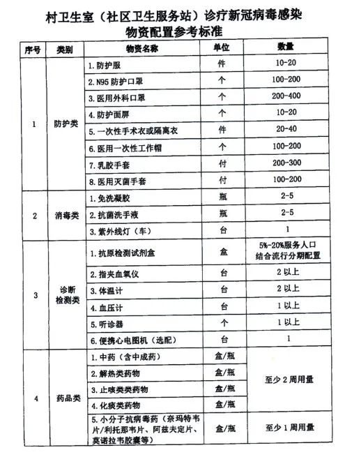 以下是國家發(fā)布的鄉(xiāng)鎮(zhèn)衛(wèi)生室、村衛(wèi)生室新冠病毒感染物資配備標準: