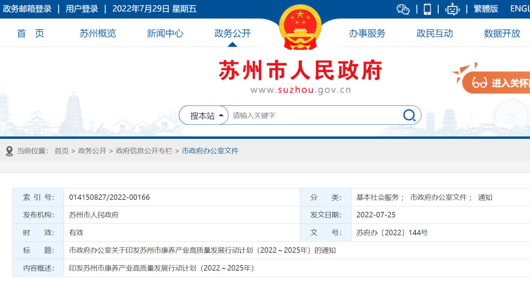 2022年7月25日,蘇州市人民政府發(fā)布《關(guān)于印發(fā)蘇州市康養(yǎng)產(chǎn)業(yè)高質(zhì)量發(fā)展行動(dòng)計(jì)劃(2022~2025年)的通知》。
